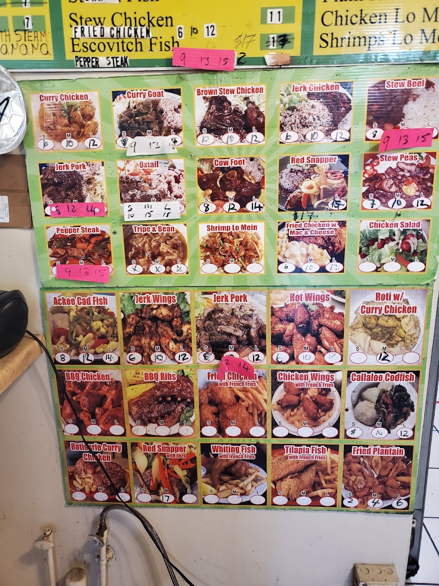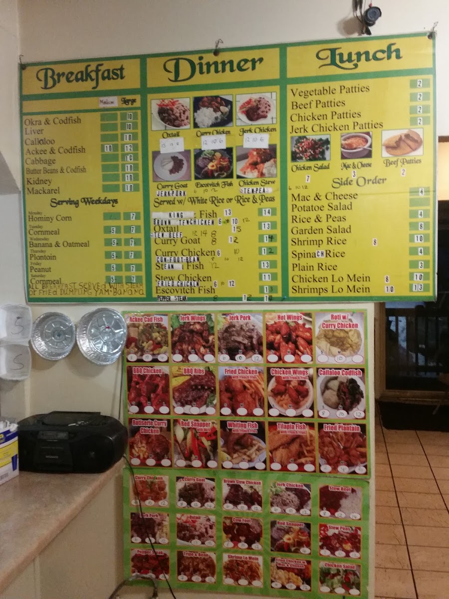 Wireless Caribbean Restaurant offers a delightful selection of traditional Caribbean dishes that cater to a variety of tastes. For drinks, guests can choose from refreshing options like Tropicana Orange Juice, Coconut Water, Supligen, Tropicana Cranberry, and Aloe Vera Drink (1.5L). The Delicious Duos section presents convenient pairings, such as Sandwich & Salad, Sandwich & Soup, and Sandwich & Chips, perfect for a light meal. For lunch or dinner, patrons can enjoy flavorful options like Jerk Chicken, Escovitch Fish, Curry Goat, Jerk Pork, and Fried Chicken. Breakfast choices include the classic Callaloo and Salt Fish and Ackee & Salt Fish. The soups menu features hearty Chicken Soup and Goat Soup. Side orders like Chicken Patty with Cocoa Bread, 2-Piece Boiled Dumplings, Mac & Cheese, Steamed Cabbage, and 3-Piece Fried Dumpling complement the main dishes. For those craving a quick snack, there are treats like Water Crackers, Tutti Fruti, Shirley Biscuits, Golden Krust Rock Cake, and Golden Krust Roun Bun (Spice Bun). With such a diverse and authentic menu, Wireless Caribbean Restaurant offers a satisfying dining experience that highlights the bold flavors of the Caribbean.
